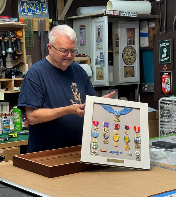 Woody preparing a Medal of Honor for a shadowbox presentation.